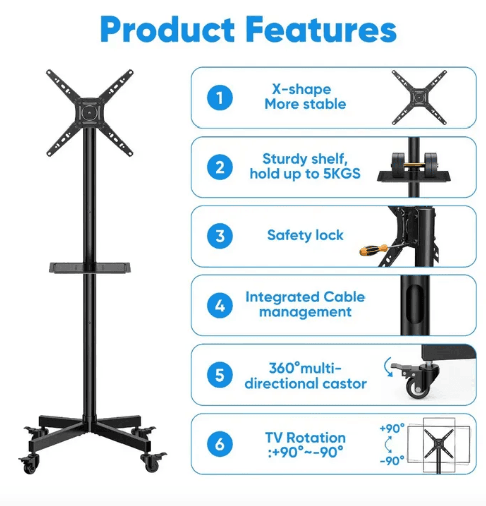 El soporte de TV móvil con ruedas Aspor Rack está diseñado para pantallas de 32 a 70 pulgadas, soportando hasta 55 kg. Su estructura de acero resistente y ruedas con freno permiten desplazarlo fácilmente y mantenerlo estable. Ideal para oficinas, salones de clases o presentaciones, combina funcionalidad con un montaje sencillo y seguro.