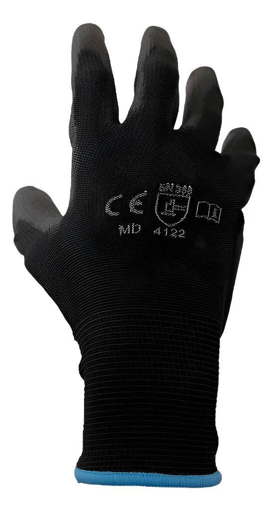 Guante fabricado de nylon y poliuretano en palma color negro, ausencia de costuras, con puño tejido de punto ribeteado. Manipulación general, protección contra riesgos mecánicos donde este implicada cualquier herramienta pero que requiera tacto, flexibilidad, comodidad y precisión. Buen agarre tanto en seco como en superficies húmedas con?